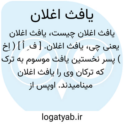 یافث اغلان. [ ف ِ اُ ] ( اِخ ) پسر نخستین یافث موسوم به ترک که ترکان وی را یافث اغلان مینامیدند. اوپس از مرگ پدر قائم مقام وی شد و بغایت عاقل و مردانه و مؤدب و فرزانه بود. ( حبیب السیر جزء 1 ج 3 ص 3 ).