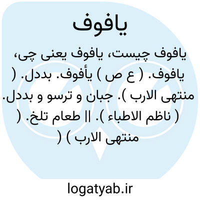 یافوف. ( ع ص ) یأفوف. بددل. ( منتهی الارب ). جبان و ترسو و بددل. ( ناظم الاطباء ). || طعام تلخ. ( منتهی الارب ) ( ناظم الاطباء )( از اقرب الموارد ). || شتاب رو. ( از منتهی الارب ) ( از ناظم الاطباء ). سبک و تندرو. خفیف سریع. ( اقرب الموارد ). || تیزخاطر. || بچه دراج. || درمانده سست و ضعیف. ( منتهی الارب ) ( از ناظم الاطباء ). || آن که در زبان وی لکنت باشد. ( ناظم الاطباء ). ج، یآفیف. ( اقرب الموارد ).
