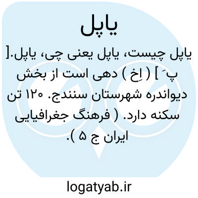 یاپل.[ پ َ ] ( اِخ ) دهی است از بخش دیواندره شهرستان سنندج. 120 تن سکنه دارد. ( فرهنگ جغرافیایی ایران ج 5 ).