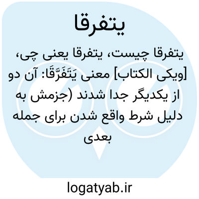 دانشنامه اسلامی [ویکی الکتاب] معنی یَتَفَرَّقَا: آن دو از یکدیگر جدا شدند (جزمش به دلیل شرط واقع شدن برای جمله بعدی است)ریشه کلمه: فرق (۷۲ بار)