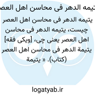 [ویکی فقه] یتیمة الدهر فی محاسن اهل العصر (کتاب). « یتیمة الدهر فی محاسن اهل العصر»، کتابی است به زبان عربی، تألیف ابو منصور عبد الملک ثعالبی نیشابوری که به ترجمه و شرح کاملی از زندگانی بسیاری از شعرای معاصر ثعالبی و یا کسانی که به فاصله کمی قبل از او می زیسته اند، می پردازد.