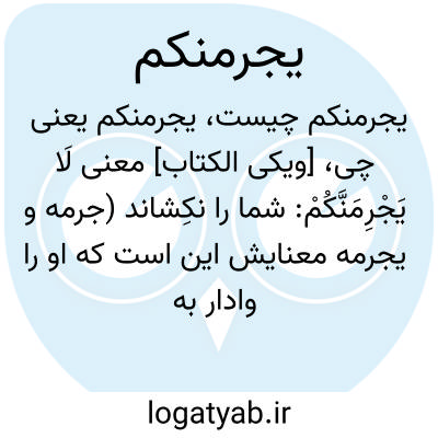 [ویکی الکتاب] معنی لَا یَجْرِمَنَّکُمْ: شما را نکِشاند (جرمه و یجرمه معنایش این است که او را وادار به جرم کرد، و اگر معصیت را هم جریمه میگویند چون وبال و عقوبت آن، که یا مال است و یا شکنجه بر آدمی تحمیل میشود. راغب گفته است: اصل در معنای ماده جیم - را - میم بریدن است)