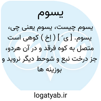 یسوم. [ ی َ ] ( اِخ ) کوهی است متصل به کوه فرقد و در آن هردو، جز درخت نبع و شوحط دیگر نروید و بوزینه ها در وی بسیار باشد. بر فراز آنها رفتن بسی دشوار باشد و مسکن میمونهاست و آب آن منحصراً از آب باران جمع شده در گودالهاست. ( از معجم البلدان ).