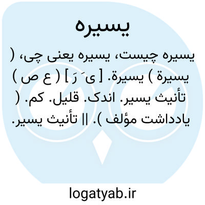 ( یسیرة ) یسیرة. [ ی َ رَ ] ( ع ص ) تأنیث یسیر. اندک. قلیل. کم. ( یادداشت مؤلف ). || تأنیث یسیر. آسان.سهل. خوار. ( یادداشت مؤلف ). و رجوع به یسیر شود.