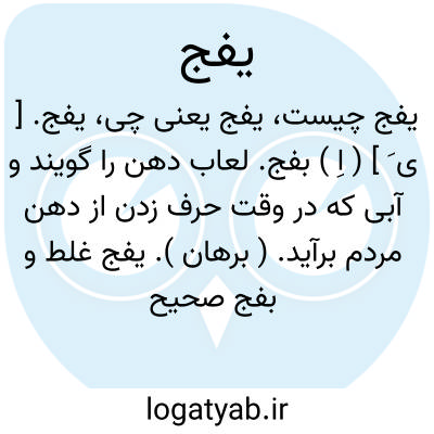 یفج. [ ی َ ] ( اِ ) بفج. لعاب دهن را گویند و آبی که در وقت حرف زدن از دهن مردم برآید. ( برهان ). یفج غلط و بفج صحیح است. ( یادداشت مؤلف ). مصحف بفج است. ( از حاشیه برهان چ معین ). و رجوع به بفج شود.