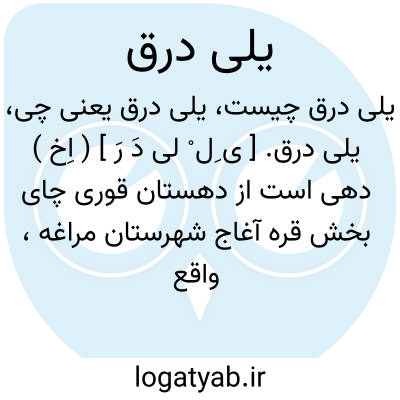 یلی درق. [ ی ِل ْ لی دَ رَ ] ( اِخ ) دهی است از دهستان قوری چای بخش قره آغاج شهرستان مراغه، واقع در 6هزارگزی شوسه مراغه -میانه، با 575 تن سکنه. آب آن ازچشمه و راه آن مالرو است. در دو محل به فاصله هزارگز به نام بالا و پایین مشهور است. سکنه بالا 325 و پایین 250 تن است. ( از فرهنگ جغرافیایی ایران ج 4 ).