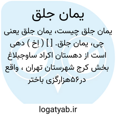 یمان جلق. [ ] ( اِخ ) دهی است از دهستان اکراد ساوجبلاغ بخش کرج شهرستان تهران، واقع در56هزارگزی باختر کرج و 7هزارگزی راه شوسه کرج به قزوین. راه آن مالرو است و از طریق آبه یک و کاظم آباد ماشین می توان برد. ( از فرهنگ جغرافیایی ایران ج 1 ).