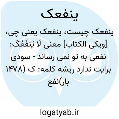 دانشنامه اسلامی [ویکی الکتاب] معنی لَا یَنفَعُکَ: نفعی به تو نمی رساند - سودی برایت نداردریشه کلمه: ک (۱۴۷۸ بار)نفع (۵۰ بار)