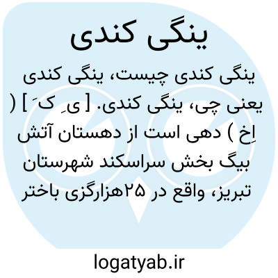 ینگی کندی. [ ی ِ ک َ ] ( اِخ ) دهی است از دهستان آتش بیگ بخش سراسکند شهرستان تبریز، واقع در 25هزارگزی باختر سراسکند، با 150 تن سکنه. آب آن از چشمه و راه آن مالرو است. ( از فرهنگ جغرافیایی ایران ج 4 ).