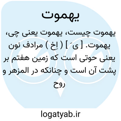 یهموت. [ ی َ ] ( اِخ ) مرادف نون یعنی حوتی است که زمین هفتم بر پشت آن است و چنانکه در المزهر و روح البیان آمده است آن را لوتیاء نیز نامند و معلوم است که میان آن و زحل که در فلک هفتم است فاصله بسیار بعید باشد. شهاب خفاجی در حاشیه ای که بر بیضاوی نوشته در اول سوره نون گوید: یهموت به فتح یاء است و آنچه شهرت یافته که به باء است غلط است و در روح البیان نیز همین معنی آمده است. ( از حاشیه ابن خلدون ص 2 ).