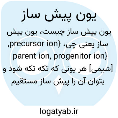 {precursor ion, parent ion, progenitor ion} [شیمی] هر یونی که تکه تکه شود و بتوان آن را پیش ساز مستقیم یک یون تکۀ نهایی به شمار آورد