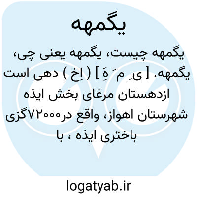 یگمهه. [ ی ِ م َ هَِ ] ( اِخ ) دهی است ازدهستان مرغای بخش ایذه شهرستان اهواز، واقع در72000گزی باختری ایذه، با 115 تن سکنه. آب آن از چشمه و راه آن مالرو است. ( از فرهنگ جغرافیایی ایران ج 6 ).