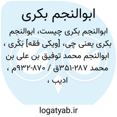 [ویکی فقه] بَکْری، ابوالنجم محمد توفیق بن علی بن محمد ۲۸۷-۳۵۱ق / ۸۷۰-۹۳۲م، ادیب، شاعر، صوفی و اشراف زاده متدین و دولتمرد مصری می باشد.