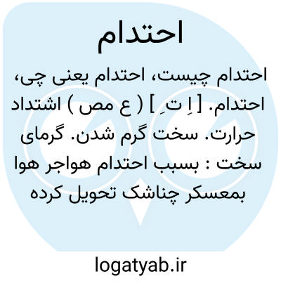 احتدام. [ اِ ت ِ ] ( ع مص ) اشتداد حرارت. سخت گرم شدن. گرمای سخت: بسبب احتدام هواجر هوا بمعسکر چناشک تحویل کرده بود. ( ترجمه تاریخ یمینی ). مجدالدوله از احتدام ایّام فتنه واتّقاد شرر شرّ ملول شد ( ترجمه تاریخ یمینی ). || زبانه کشیدن آتش. افروخته شدن آتش. احتماد ( مقلوب احتدام ). ( منتهی الارب ). || سخت شدن سورت شراب. || سخت شدن رنگ سُرخی خون تا مایل بسیاهی شود. || سخت شدن خشم کسی. برجوشیدن دل از خشم. دندان سائیدن بر کسی از خشم. دندان غِرچه رفتن بر کس از خشم. افروخته شدن روی از غضب.