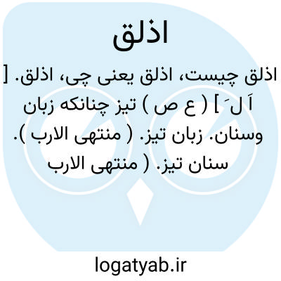 اذلق. [ اَ ل َ ] ( ع ص ) تیز چنانکه زبان وسنان. زبان تیز. ( منتهی الارب ). سنان تیز. ( منتهی الارب ). || ( ن تف ) تیزتر: هذا اذلق من هذا؛ ای احد منه. ( معجم البلدان در ماده اذلق ). ج، ذُلق.