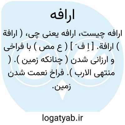 ( ارافة ) ارافة. [ اِ ف َ ] ( ع مص ) با فراخی و ارزانی شدن ( چنانکه زمین ). ( منتهی الارب ). فراخ نعمت شدن زمین. ( مؤید الفضلاء ). || بزمین علفناک رسیدن. ( منتهی الارب ). بزمین فراخ نعمت درشدن. ( مؤید الفضلاء ).