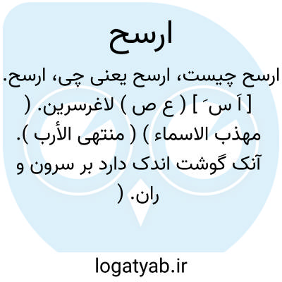 ارسح. [ اَ س َ ] ( ع ص ) لاغرسرین. ( مهذب الاسماء ) ( منتهی الأرب ). آنک گوشت اندک دارد بر سرون و ران. ( تاج المصادر بیهقی ) ( زوزنی ). آن که سرون و ران او اندک گوشت باشد. || ( اِ ) گرگ ( بعلت لاغری سرین وی ). || ازل. ذئب یتولدبین الذئب و الضبع. || ( ن تف ) لاغرسرین تر.