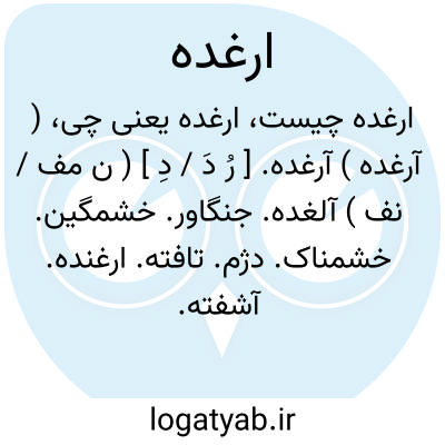 ( آرغده ) آرغده. [ رُ دَ / دِ ] ( ن مف / نف ) آلغده. جنگاور. خشمگین. خشمناک. دژم. تافته. ارغنده. آشفته. برآشفته. بخشم آمده. خشمین. غضبناک. غضب آلود. خشمن. کج خلق. اوقات تلخ. قهرآلود. خشم آلود. مقابل آرمیده: