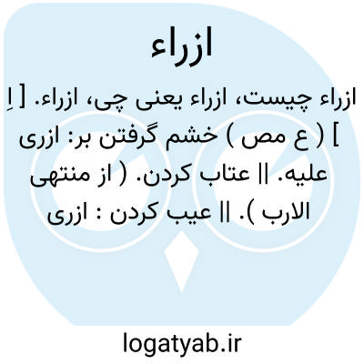 ازراء. [ اِ ] ( ع مص ) خشم گرفتن بر: ازری علیه. || عتاب کردن. ( از منتهی الارب ). || عیب کردن: ازری باخیه. || عیبناک کردن. عیب بر کسی افکندن. معیوب کردن کسی را. افکندن امری که اراده تلبیس کسی بدان دارد. ( منتهی الارب ): و له خط یزری بخط ابن مقلة علی طریقته. ( یاقوت حموی در معجم الادباء ج 1 ص 118 س 5 ). ازراء در اینجاملتبس و مشتبه شدن است؛ یعنی میشد خط او را با خط ابن مقله جا زدن. || خوار داشتن. حقیر شمردن. ( منتهی الارب ). حقیر داشتن. ( زوزنی ). خرد داشتن. ( تاج المصادر بیهقی ). زبون داشتن: ازری بالامر. || سستی کردن در کاری. تهاون.