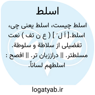 اسلط.[ اَ ل َ ] ( ع ن تف ) نعت تفضیلی از سلاطة و سلوطة. مسلطتر. || دراززبان تر. || افصح: اسلطهم لساناً. ( منتهی الارب ). || سلیطه تر: طلب [سقراط] تزویج المراءة السفیهة [ ظ:السلیطة ] التی لم یکن فی بلده اسلط منها. ( عیون الانباء ج 1 ص 43 ).
