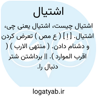لغت نامه دهخدا اشتیال. [ اِ ] ( ع مص ) تعرض کردن و دشنام دادن. ( منتهی الارب ) ( اقرب الموارد ). || برداشتن شتر دنبال را. ( منتهی الارب ).