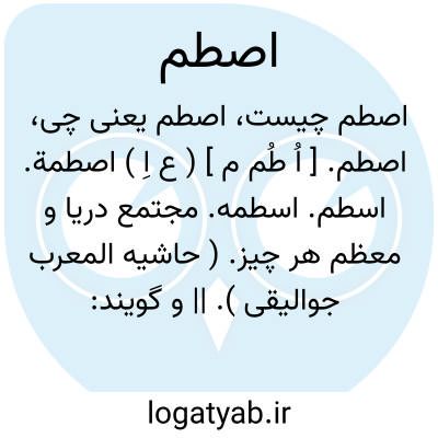 اصطم. [ اُ طُم م ] ( ع اِ ) اصطمة. اسطم. اسطمه. مجتمع دریا و معظم هر چیز. ( حاشیه المعرب جوالیقی ). || و گویند: وی در اسطمه قوم خویش است؛ یعنی در وسط ایشان و از اشراف و برگزیدگان آنانست. و صاحب اللسان ( 13:18 ) عبارت شمر را که گفته است صاد و طا در کلمه عرب با هم گرد نیاید چنین نقل کرده است: صاد و طا در صراط و اصطبل و اصطمه آمده است و اصل همه آنها سین است. ( از حاشیه المعرب ص 44 ). و رجوع به اصطمه شود.