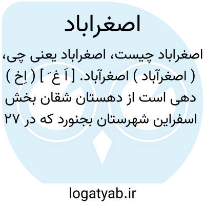 ( اصغرآباد ) اصغرآباد. [ اَ غ َ ] ( اِخ ) دهی است از دهستان شقان بخش اسفراین شهرستان بجنورد که در 27 هزارگزی شمال اسفراین و 8 هزارگزی جنوب شوسه عمومی بجنورد به شقان واقع است و محلی جلگه و سردسیرمیباشد و سکنه آن 76 تن است که بزبان فارسی و کردی سخن گویند و از مذهب شیعه پیروی کنند. آب آن از قنات تأمین میشود و محصول آن غلات و تریاک و شغل اهالی زراعت و مالداری است. صنایع دستی مردم قالیچه بافی و راه ده مالرو است. ( از فرهنگ جغرافیائی ایران ج 9 ).