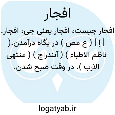 افجار. [ اِ ] ( ع مص ) در پگاه درآمدن.( ناظم الاطباء ) ( آنندراج ) ( منتهی الارب ). در وقت صبح شدن. ( المصادر زوزنی ). || فاجر یافتن کسی را. || دروغ بربافتن. || زنا کردن. || ناگرویدن و میل کردن از حق. || مال بسیار آوردن. || بیرون آوردن آب چشمه را. ( منتهی الارب ) ( آنندراج ) ( ناظم الاطباء ).