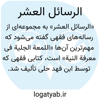 [ویکی فقه] الرسائل العشر (اللمعه الجلیه فی معرفه النیه ). اللمعة الجلیة فی معرفة النیة کتاب فقهی تالیف ابن فهد حلی (م ۸۴۱ ق).