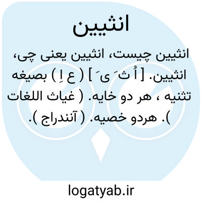 انثیین. [ اُ ث َ ی َ ] ( ع اِ ) بصیغه تثنیه، هر دو خایه. ( غیاث اللغات ). هردو خصیه. ( آنندراج ). دو خصیه. حذنتان. دوخایه. تخمها که از اعضاء رئیسه چهارگانه قدماست. ( یادداشت مؤلف ): بوزنه بر چوب نشست از آن جانب که بریده بود انثیین او در شکاف چوب آویخته بود. ( کلیله و دمنه چ مینوی ص 62 ). || دو مؤنث. دو زن. دو دختر: یوصیکم اﷲ فی اولادکم للذکر مثل حظ الانثیین. ( قرآن 11/4 )؛ اندرز میکند خدای شما رادر کار فرزندان شما پسر را چَنِد بهره دو دختر. ( کشف الاسرار ج 2 ص 430 ). و رجوع به انثی و انثیان شود.