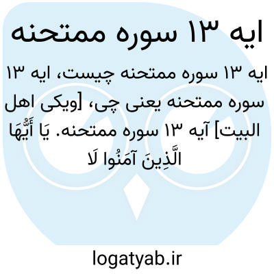 [ویکی اهل البیت] آیه 13 سوره ممتحنه. یَا أَیُّهَا الَّذِینَ آمَنُوا لَا تَتَوَلَّوْا قَوْمًا غَضِبَ اللَّهُ عَلَیْهِمْ قَدْ یَئِسُوا مِنَ الْآخِرَةِ کَمَا یَئِسَ الْکُفَّارُ مِنْ أَصْحَابِ الْقُبُورِ