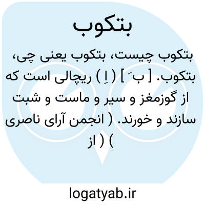 بتکوب. [ ب َ ] ( اِ ) ریچالی است که از گوزمغز و سیر و ماست و شبت سازند و خورند. ( انجمن آرای ناصری ) ( از فرهنگ نظام ) ( ناظم الاطباء ) ( آنندراج ). ریچالی است که از مغز گوز و سیر و ماست کنند ترش باشد. ( فرهنگ اسدی ) ( اوبهی ). بتلوب. ( برهان قاطع ). نوع حلوائی است که با عسل و شیر ومغز گردو درست کنند. ( از فرهنگ شعوری ):
