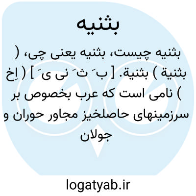 ( بثنیة ) بثنیة. [ ب َ ث َ نی ی َ ] ( اِخ ) نامی است که عرب بخصوص بر سرزمینهای حاصلخیز مجاور حوران و جولان ماوراء اردن داده است و مرکز آن اذرعات ( درعا ) بود وعرب بسال 634 م. آنجا را گرفت. ( از اعلام المنجد ).