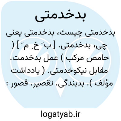 بدخدمتی. [ ب َ خ ِ م َ ] ( حامص مرکب ) عمل بدخدمت. مقابل نیکوخدمتی. ( یادداشت مؤلف ). بدبندگی. تقصیر. قصور: اما قضای حق برادرش اقچه که بهیچوقت ازو بادره بدخدمتی صادر نشده است جان او ببخشیدم. ( جهانگشای جوینی ). با تقصیر و بدخدمتی که صادر شد از اهالی آن خشم گرفت. ( ترجمه محاسن اصفهان ص 82 ).
