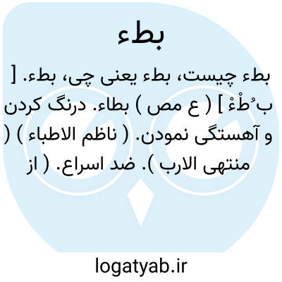 بطء. [ ب ُطْءْ ] ( ع اِ ) بُطوع. درنگی وآهستگی. ( منتهی الارب ) ( ناظم الاطباء ) ( آنندراج ). || و قولهم لم افعله بطاً یا هذا و بُطآی؛ یعنی نکرده ام آن را گاهی. ( منتهی الارب ) ( ناظم الاطباء ).