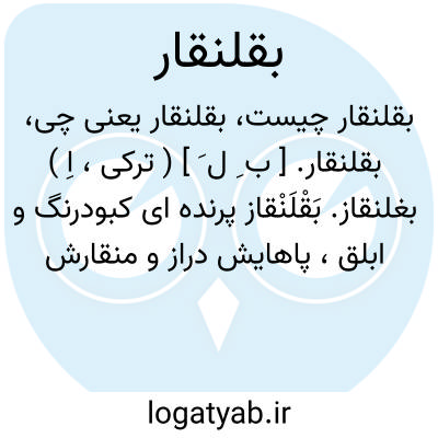 بقلنقار. [ ب ِ ل َ ] ( ترکی، اِ ) بغلنقاز. بَقْلَنْقاز پرنده ای کبودرنگ و ابلق، پاهایش دراز و منقارش پهن و گوشتش حلال و مأکول. ( از ناظم الاطباء ) ( از سروری ). جانوری است بزرگ. ( شرفنامه منیری ). میرزا ابراهیم گوید که این لفظ ترکی است. ( سروری ). || نام گوشه ای است از چهل و هشت گوشه نغمات. ( سروری ). رجوع به بغلنقاز شود.