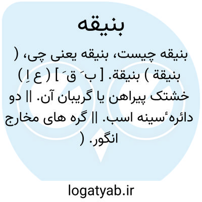 ( بنیقة ) بنیقة. [ ب َ ق َ ] ( ع اِ ) خشتک پیراهن یا گریبان آن. || دو دائره ٔسینه اسب. || گره های مخارج انگور. ( منتهی الارب ) ( آنندراج ) ( ناظم الاطباء ). || وصله که به لباس یا دلو اضافه کنند تا گشاده شود. ( از ذیل اقرب الموارد ). || موی پیچان که میان شکنهای تهیگاه اسب است. ( منتهی الارب ) ( ناظم الاطباء ) ( آنندراج ) ( از ذیل اقرب الموارد ). رجوع به بنقه شود.