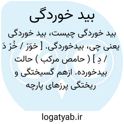 بیدخوردگی. [ خوَرْ / خُرْ دَ / دِ ] ( حامص مرکب ) حالت بیدخورده. ازهم گسیختگی و ریختگی پرزهای پارچه پشمی یا قالی و قالیچه که بسبب افتادن کرم بید پیدا شود.