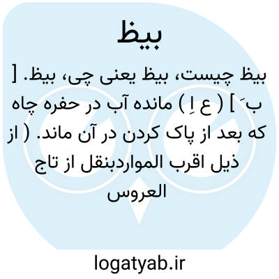 بیظ. [ ب َ ] ( ع اِ ) مانده آب در حفره چاه که بعد از پاک کردن در آن ماند. ( از ذیل اقرب المواردبنقل از تاج العروس ). || بمعنی تخم مورچه همچنان که بیض برای غیر از مورچه باشد و چنین معروفست که تخم مورچه را بیظ و تخمهای دیگر را بیض نویسند. ( از اقرب الموارد ). || پوست تنک خایه ( تخم ). ( از ذیل اقرب الموارد بنقل از تاج العروس ). || تصویر چهره انسان بر روی شمشیر یمانی. ( از ذیل اقرب الموارد بنقل از تاج العروس ). || منی زن. ( منتهی الارب ). آب زن. ( از اقرب الموارد ). || منی مرد. ( منتهی الارب ) ( از اقرب الموارد ) ( از لسان العرب ). منی فحل. ( منتهی الارب ). || زهدان. ( منتهی الارب ). رحم. ج، بَیْظ. لغتی است در بیظة. ( از اقرب الموارد ). رحم. ( لسان العرب ).