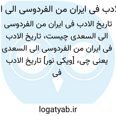 [ویکی نور] تاریخ الادب فی ایران من الفردوسی الی السعدی (تعریب). "تاریخ الادب فی ایران من الفردوسی الی السعدی" کتابی است به زبان عربی دربارۀ ادبیات فارسی، شرح احوال، آثار شاعران و نویسندگان ایرانی از زمان فردوسی تا سعدی شیرازی، که از متن انگلیسی آن، که توسط ادوارد گرانویل براون، خاورشناس انگلیسی نوشته شده، برگردان شده است.