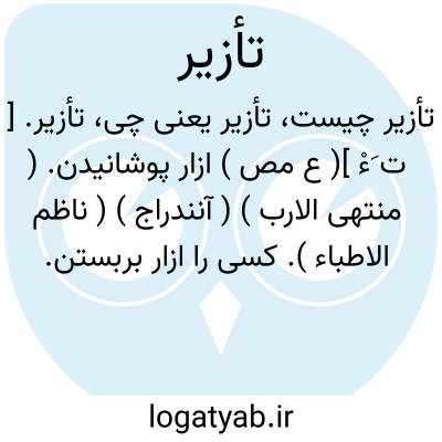تأزیر. [ ت َءْ ]( ع مص ) ازار پوشانیدن. ( منتهی الارب ) ( آنندراج ) ( ناظم الاطباء ). کسی را ازار بربستن. ( تاج المصادر بیهقی ). پوشاندن. ( از اقرب الموارد ) ( از قطر المحیط ). || قوی ساختن. گویند: «فلان ازرّ حیطان الدار»؛یعنی پائین دیوارهای خانه را کهگل کرد و مستحکم گردانید. ( منتهی الارب ) ( آنندراج ) ( ناظم الاطباء ). تقویت کردن چیزی را. ( از اقرب الموارد ) ( از قطر المحیط ).