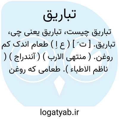 تباریق. [ ت َ ] ( ع اِ ) طعام اندک کم روغن. ( منتهی الارب ) ( آنندراج ) ( ناظم الاطباء ). طعامی که روغن آن کم باشد. ( از اقرب الموارد ).