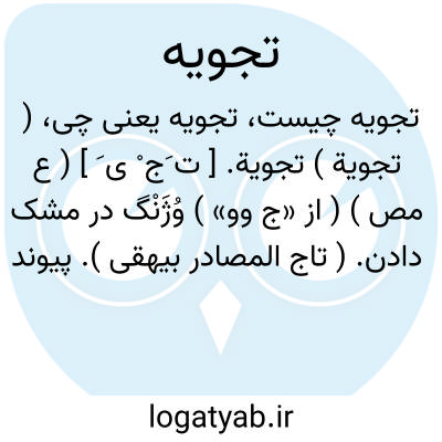 لغت نامه دهخدا ( تجویة ) تجویة. [ ت َج ْ ی َ ] ( ع مص ) ( از «ج وو» ) وُژَنْگ در مشک دادن. ( تاج المصادر بیهقی ). پیوند کردن خیک را. ( منتهی الارب ) ( ناظم الاطباء ). رقعه زدن خیک را. ( اقرب الموارد ) ( قطر المحیط ).