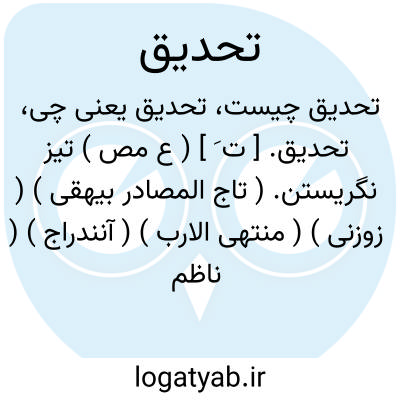 تحدیق. [ ت َ ] ( ع مص ) تیز نگریستن. ( تاج المصادر بیهقی ) ( زوزنی ) ( منتهی الارب ) ( آنندراج ) ( ناظم الاطباء ) ( از اقرب الموارد ) ( از قطر المحیط ). رجوع به تحدیج شود. || گرد کسی درآمدن. ( تاج المصادر بیهقی ) ( منتهی الارب ) ( آنندراج ) ( ناظم الاطباء ).