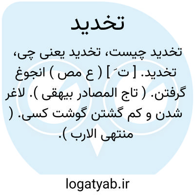 تخدید. [ ت َ ] ( ع مص ) انجوغ گرفتن. ( تاج المصادر بیهقی ). لاغر شدن و کم گشتن گوشت کسی. ( منتهی الارب ). لاغر شدن و کم گردیدن و درکشیده شدن و ترنجیدن گوشت کسی. ( اقرب الموارد ) ( از المنجد ). لاغر شدن. ( ناظم الاطباء ) ( المنجد ). || لاغر گردانیدن. لازم و متعدی است. ( اقرب الموارد ) ( منتهی الارب ) ( ناظم الاطباء ). || شکافتن چیزی را. ( منتهی الارب ) ( ناظم الاطباء ).