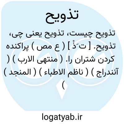 تذویح. [ ت َذْ ] ( ع مص ) پراکنده کردن شتران را. ( منتهی الارب ) ( آنندراج ) ( ناظم الاطباء ) ( المنجد ) ( اقرب الموارد ). || پریشان و متفرق گردانیدن مال را. ( منتهی الارب ) ( آنندراج ) ( ناظم الاطباء ): کل ما فرقه فقد ذوّحه. ( اقرب الموارد ).