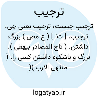 ترجیب. [ ت َ ] ( ع مص ) بزرگ داشتن. ( تاج المصادر بیهقی ). بزرگ و باشکوه داشتن کسی را. ( منتهی الارب )( ناظم الاطباء ) ( از اقرب الموارد ) ( از المنجد ). تعظیم. ( غیاث اللغات ). بزرگ داشتن و شکوه داشتن. ( آنندراج ). || چیزی فرا زیر درخت نهادن تا نشکند از بسیاری ِ بار. ( تاج المصادر بیهقی ). ستون نهادن درخت پربار را، و گاه باشد که بر آن دیواری بنا نمایندتا بر آن دیوار اعتماد نماید و این از جهت ضعف درخت و کثرت بار آن است. ( منتهی الارب ) ( ناظم الاطباء ). بنا کردن دکان و دیوار یا ستون نهادن زیر درخت پربار تا نیفتد و این از جهت ضعف درخت و کثرت بار آن است. ( آنندراج ). ساختن دکانی در زیر نخلة تا بر آن اعتماد نماید از جهت ضعف. ( از اقرب الموارد ) ( از المنجد ). منه المثل: انا جذیلها المحکک و عذیقها المرجب؛ یعنی من رجبة ایشانم که بعقل و فکر من تقویت حاصل می نمایند و از مکروهات نجات می یابند. ( منتهی الارب ) ( ناظم الاطباء ). || خوشه های خرمابن را یا شاخه های وی به برگهای آن بستن تا باد خوشه ها را نریزاند. ( منتهی الارب ) ( ناظم الاطباء ) ( آنندراج ). || در حوالی خرمابن خار نهادن تا دست کسی بدان نرسد. ( منتهی الارب ) ( ناظم الاطباء ) ( آنندراج ) ( از المنجد ). || شاخه های انگور را برابر و هموار کرده بجای آن گذاشتن. ( منتهی الارب ) ( ناظم الاطباء ) ( از اقرب الموارد ). || ترجیب العتیرة؛ ذبح کردن قربان است در ماه رجب. ( منتهی الارب ). کشتن قربانی در ماه رجب. ( آنندراج ) ( از المنجد ). ذبح کردن گوسفند قربانی در ماه رجب که در جاهلیت معمول بود. ( ناظم الاطباء ).
