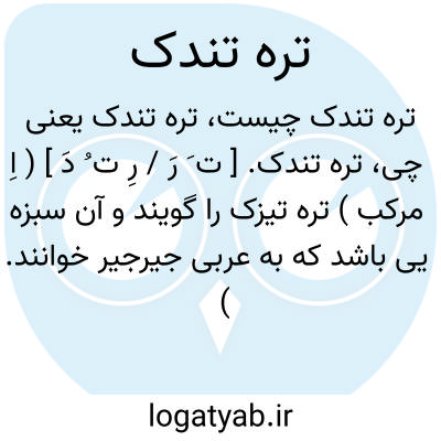 تره تندک. [ ت َ رَ / رِ ت ُ دَ ] ( اِ مرکب ) تره تیزک را گویند و آن سبزه یی باشد که به عربی جیرجیر خوانند. ( برهان ) ( آنندراج ). تره تیزک. جیرجیر. ( ناظم الاطباء ). و رجوع به تره تیزک و شاهی شود.