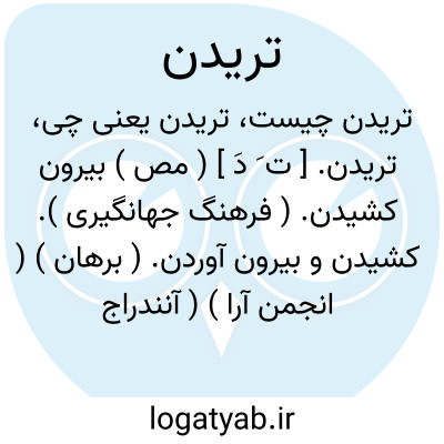 تریدن. [ ت َ دَ ] ( مص ) بیرون کشیدن. ( فرهنگ جهانگیری ). کشیدن و بیرون آوردن. ( برهان ) ( انجمن آرا ) ( آنندراج ) ( ناظم الاطباء ). کشیدن. ( غیاث اللغات )( فرهنگ رشیدی ). تزیدن. ( برهان ). و اصح بمعنی کشیدن،تزیدن باشد. ( فرهنگ رشیدی ). و رجوع به تزیدن شود.