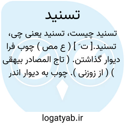دعمهد.[ ت َ ] ( ع مص ) چوب فرا دیوار گذاشتن. ( تاج المصادر بیهقی ) ( از زوزنی ). چوب به دیوار اندر وانهادن. ( ترجمان جرجانی ترتیب عادل بن علی ). چوب را زیر دیوار گذاشتن. ( منتهی الارب ) ( آنندراج ) ( از ناظم الاطباء ). استوار کردن و راست کردن چیزی را: سندالشی وثقه ُ و دعمه ُ. ( از اقرب الموارد ) ( از المنجد ). || سند بودن کسی را ( از متن اللغة ). || پوشانیدن چادر سَنَد را به کسی. ( منتهی الارب ) ( آنندراج ) ( ناظم الاطباء ). پوشیدن سند. ( از متن اللغة ) ( از المنجد ). پوشیدن سند که آن نوعی بُرد است. ( از اقرب الموارد ).